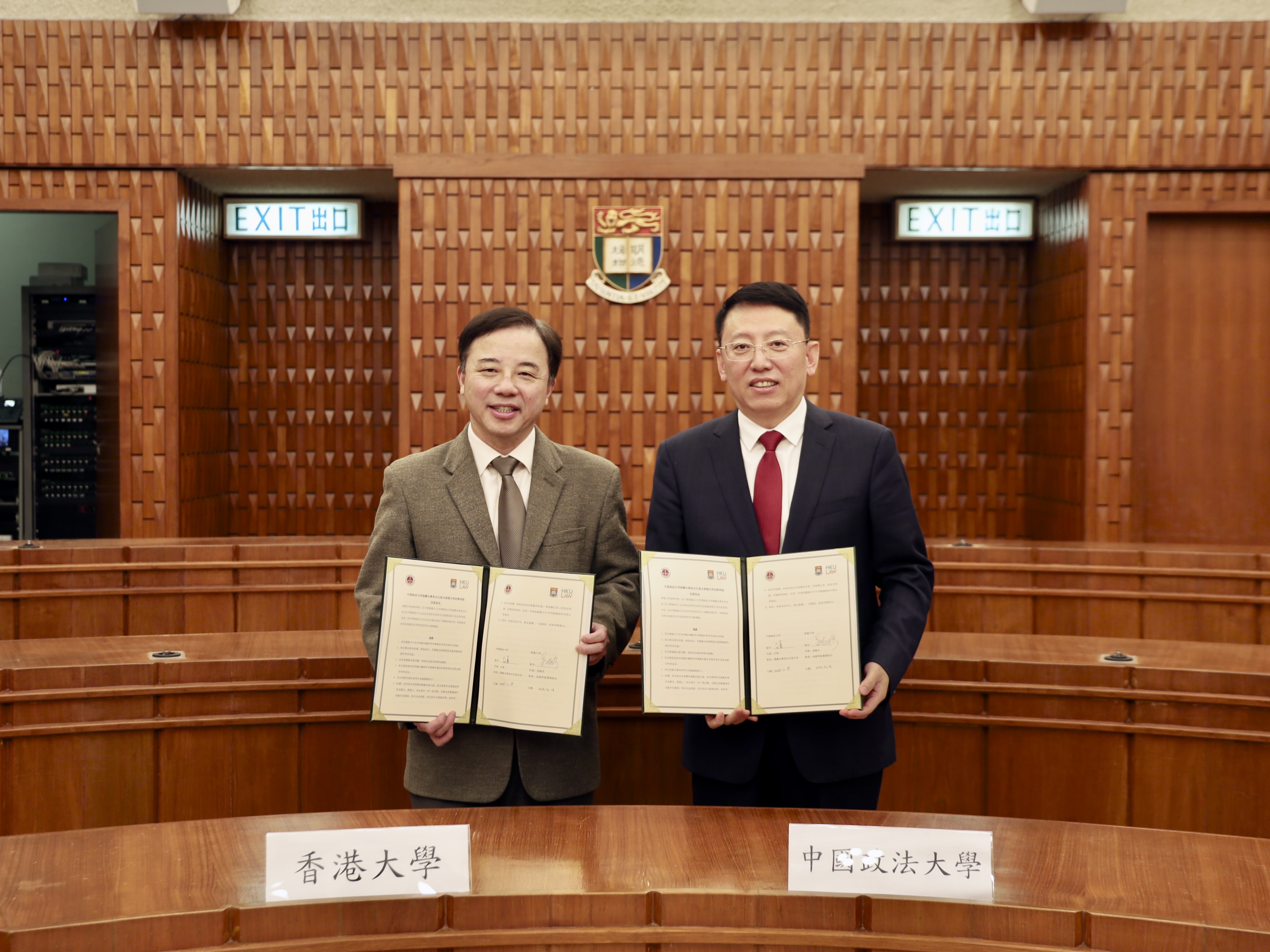 会谈结束后,姜泽廷与张翔互换新签署的两校法学领域《交流协议》。